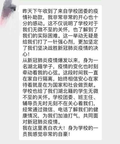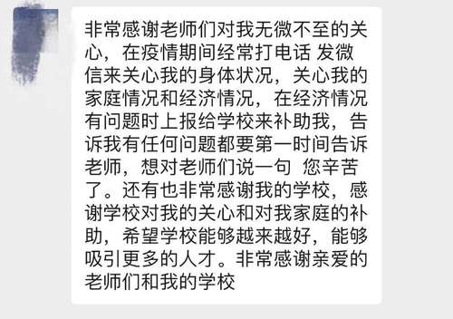 “今天收到了来自学校的补助金,非常感动。这一举动无疑是给我们打了一针强心剂,更加坚定了我们战胜疫情的信心!”