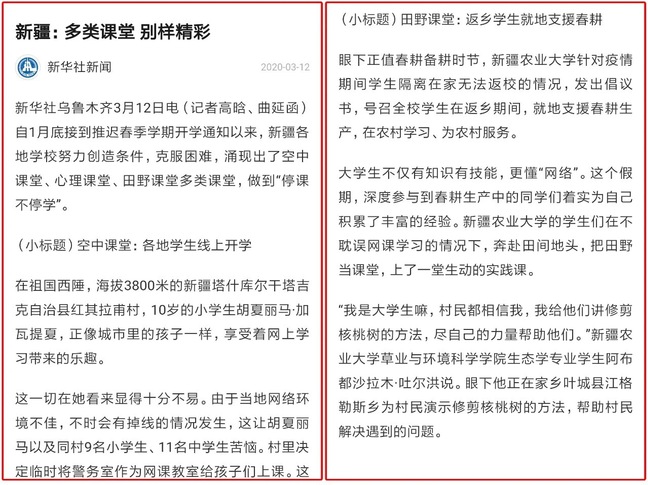 新华社乌鲁木齐3月12日电(记者高晗、曲延函)自1月底接到推迟春季学期开学通知以来,新疆各地学校努力创造条件,克服困难,涌现出了空中课堂、心理课堂、田野课堂多类课堂,做到“停课不停学”。