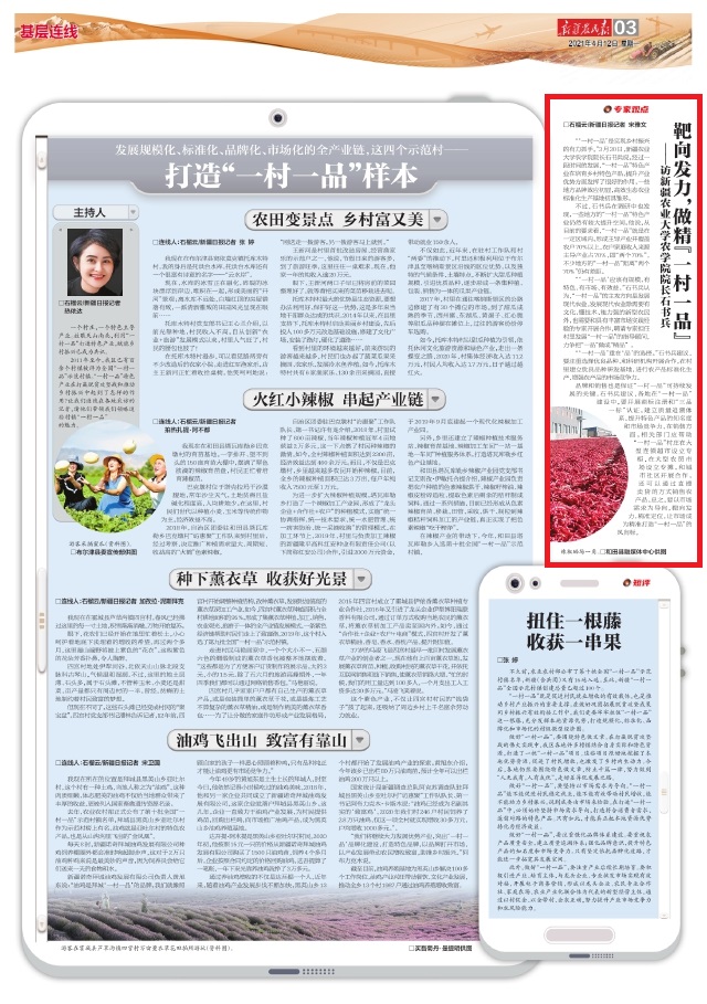 “‘一村一品’重在‘品’的选择。”石书兵建议,要注重选择优良品种,和科研机构开展合作,在村里建立优良品种研发基地,进行农产品标准化生产,增强农产品的市场竞争力。