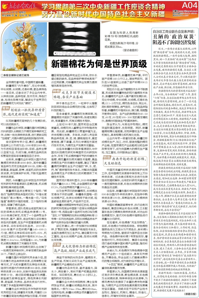 新疆长绒棉育种专家邰红忠说,他所在的研究所选育出中国首个自育长绒棉品种胜利一号、选育出首个品质与进口的埃及棉“吉扎70”相媲美的优质长绒棉品种新海13号等一系列优质品种,实现长绒棉品质丰产稳产优质综合性状集成的重大进展。