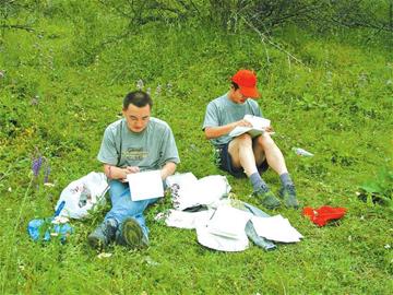 2004年廖康(右)和周龙在西天山霍城县大西沟野果林开展野生樱桃李种质资源调查。(受访者供图)