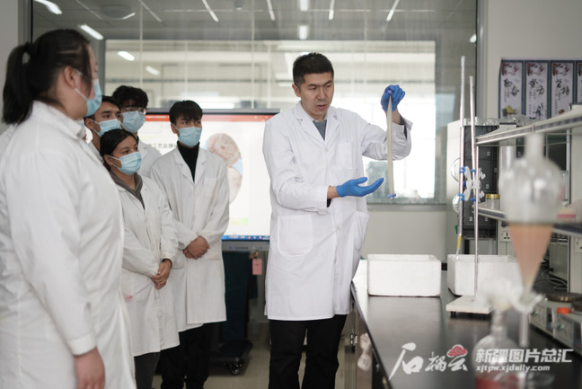 帕尔哈提·柔孜带着学生在实验室里做食品方面的科学研究。石榴云/新疆日报记者 豆兴军摄