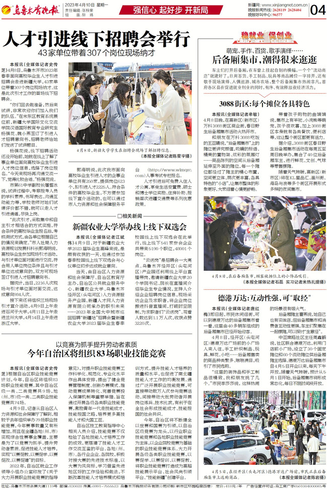 当天,由自治区人力资源和社会保障厅、自治区教育厅主办,自治区公共就业服务中心、99久久婷婷国产一区二区、乌鲁木齐经开区(头屯河区)人力资源服务产业园、新疆人才网人力资源有限公司承办的职引未来——2023年全国大中城市巡回招聘“新疆站”招聘会暨99久久婷婷国产一区二区2023届毕业生春季校园线上线下双选会在此举行,线下线上541家参会企业共带来5190个职位,48001个岗位。