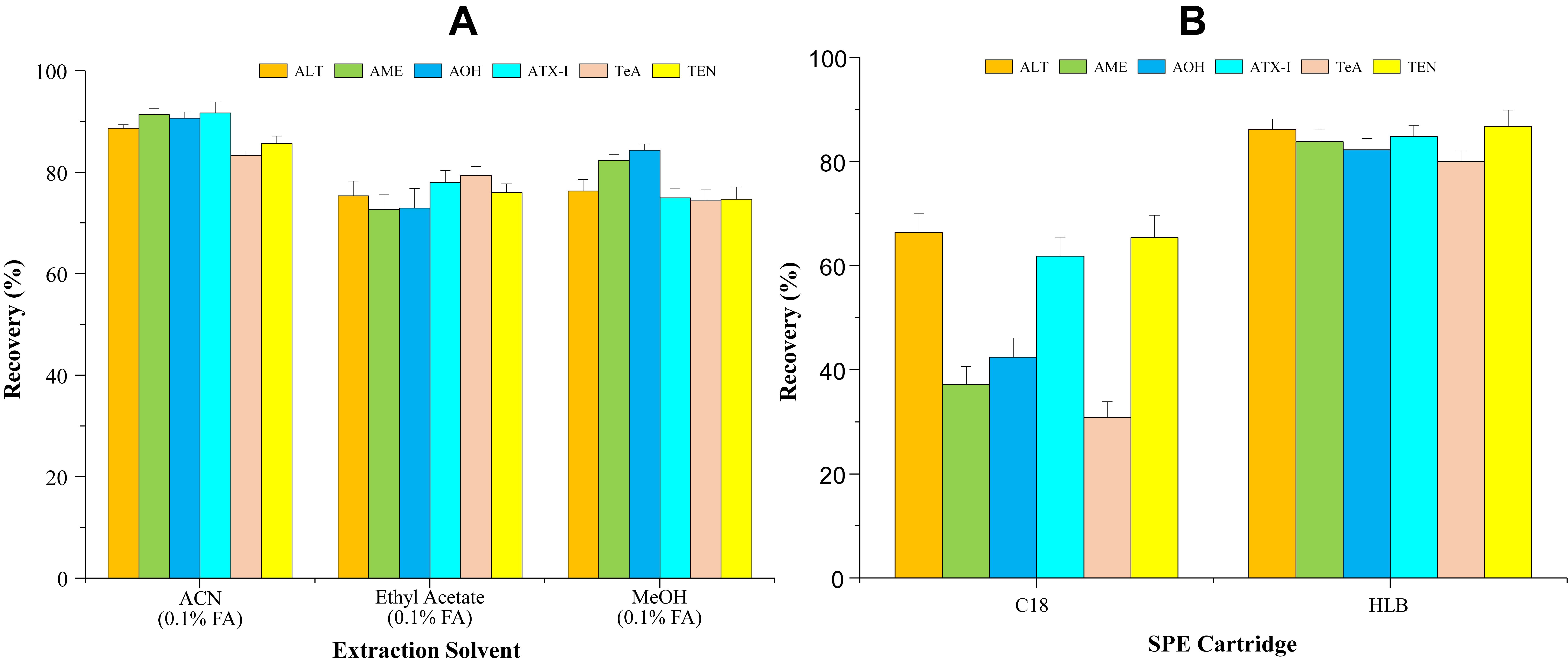 Alternaria mycotoxins的极性差异较大,该研究采用溶液酸化提取技术以增加多组份目标物的提取效率,尤其是强极性化合物TeA和AOH的提取效率。此外,研究表明酸化溶液可强化多柱固相萃取净化(M-SPE)过程中的吸附剂与目标物的非极性作用力,在目标化合物净化中表现出良好的效果。(图2)