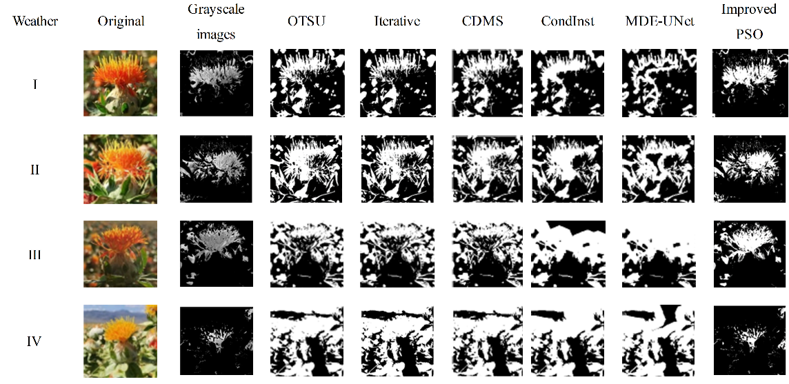 为验证该研究改进粒子群优化算法在复杂背景下的适应性和有效性,以400幅不同天气光照下的红花图像进行检测。与迭代法和OTSU法的分割结果对比,以此来评估本文算法的各项性能。试验结果表明,与其他方法的分割结果相比,该研究方法通过粒子群算法优化得到的灰度化处理红花区域得到增强,能够从其他红花、强光照叶子等的复杂背景中准确分割出红花。同时,该研究方法能够比较有效地克服非均匀光照带来的强光影响,多云光照条件下仍取得良好的分割效果(图1)。