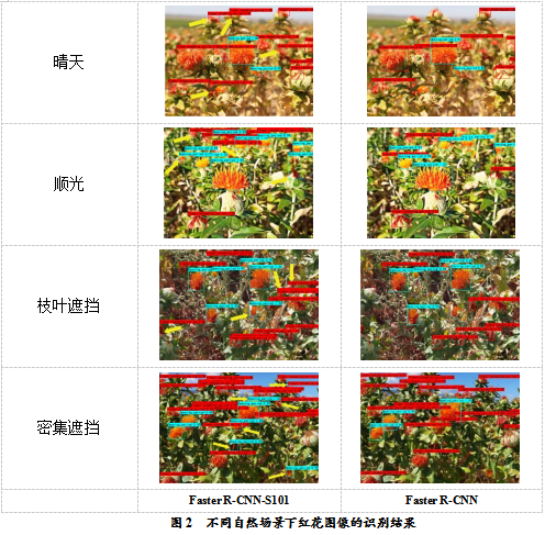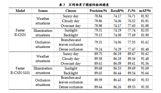 为验证Faster R-CNN-S101模型在非结构化环境中的适应性和有效性,我们根据不同的天气、光照和遮挡条件对自然场景进行了分类,并在相同的实验条件下对不同场景中的红花图像进行了检测。表3列出了不同场景下的检测数据,以此评估Faster R-CNN-S101模型的各项性能。