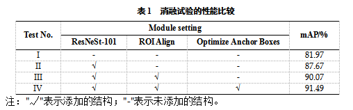 为验证Faster R-CNN-S101模型在检测小尺寸红花花丝的适应性和有效性,分别进行了四组消融测试进行验证。消融测试结果如表1所示。与Faster R-CNN模型相比,Faster R-CNN-S101模型的mAP提高了9.52%。这充分证明了使用ResNeSt-101作为骨干网络、使用ROI Align代替 ROI Pooling以及优化锚框大小可以提高网络性能。