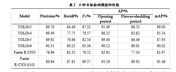 为评估Faster R-CNN-S101网络检测红花花丝的效果。在相同条件下,使用红花花丝训练集训练YOLOv3、YOLOv4、YOLOv5、YOLOv6、Faster R-CNNFaster R-CNN-S101检测模型。红花花丝测试集用于评估上述6个检测模型的检测效果。表2列出了这6个检测模型的性能比较。结果表明,Faster R-CNN-S101模型的召回率、APmAP显著高于其他模型。Faster R-CNN-S101模型在小尺寸红花花丝检测中的表现优于其他模型,具有出色的综合检测性能。