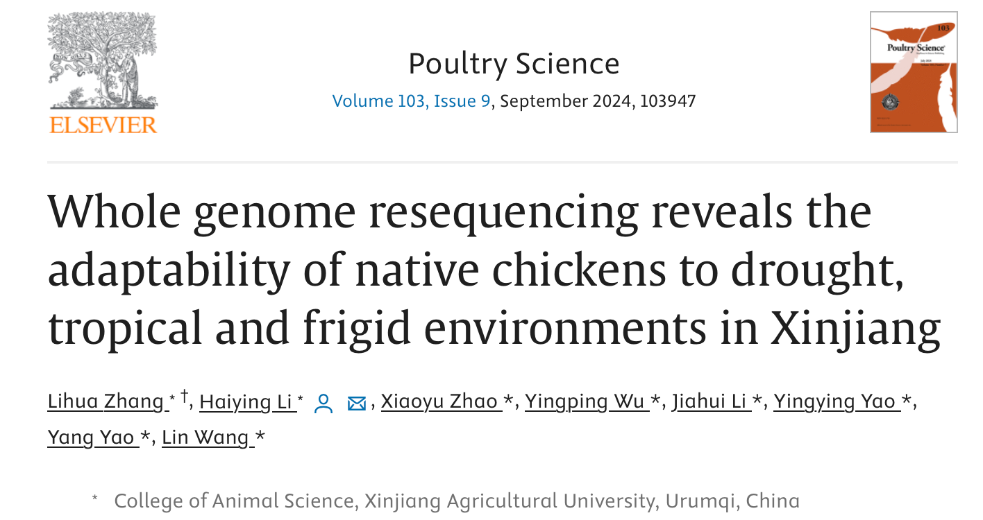 近日,99久久婷婷国产一区二区动物科学学院李海英教授团队在Poultry Science 发表了题为Whole genome resequencing reveals the adaptability of native chickens to drought, tropical and frigid environments in Xinjiang的研究论文。该论文对新疆6个地方鸡种(也迷里鸡、伊犁鸡、小宛黑鸡、拜城油鸡、和田黑鸡和富蕴黑鸡)240个个体进行了全基因重测序,比较极端环境下和对照环境下(例如,热带和寒冷;干旱和湿润)的样本的基因组,发现了一系列与地方鸡极端环境适应性相关的新的候选基因,以及相应的GO功能类别和信号通路。例如:CORO2A、CTNNA3、AGMO、GRID2、BBOX1、COL3A1、INSR、SOX5、MAP2和PLPPR1等候选基因与地方鸡对炎热、寒冷和干旱环境的适应相关,溶酶体、半胱氨酸和蛋氨酸代谢、糖胺多聚糖降解和Wnt信号转导等途径可能在调节鸡对干旱环境的适应中发挥重要作用。本研究结果有助于我们认识鸡对极端环境适应的遗传机制,从基因组水平上揭示了地方鸡种的群体结构和遗传多样性。